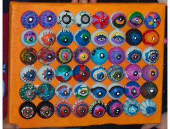 Materials/ Description of Process: Ping pong balls, acrylic paints, fine-tipped brushes. Ms. Ferdinandt's fourth grade students created this compelling piece of 3-dimensional pop art with ping-pong balls. Using acrylic paints and fine-tipped brushes, they each created a set of "eyes" covering approximately 1/3 to 1/2 of each ball. The finished eyes were mounted side by side, row by row onto a painted 11x14 canvas with PVA adhesive, creating a permanent bond. This piece of art is perfect for the living room to keep an "eye" on all of your guests!