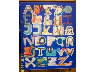 Materials/ Description of Process: 6x6 heavyweight Bristol drawing paper, various. Mediums: pencils, acrylic paints, oil pastels, wax-oils, and drawing markers. Description of Process: Ms. Tuck's brilliant fourth graders invented a new typeface, or font. Each student chose a letter of the alphabet and then illustrated the letter, using its essential shape, imagination, and artistry. The resulting font is a fantastic product of 22 minds creating a unique set. The squares, trimmed to 5x5 are mounted on a 30x36 canvas with Mod Podge adhesive, creating a permanent bond. This futuristic alphabet of fonts deserves a place in your playroom, or office!