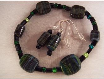 Mystic green lampwork beads are truly hypnotic. Pleasing to the touch, this enchanting artisan jewelry set includes matching earrings that are sure to create a little magic. The essence of Deb Rich's artistic expression is revealed in each lampwork bead that she creates in her studio. Deb's beads exhibit her desire to create and inspire change through community outreach. These jewelry pieces are offered exclusively through cMarket to support the fundraising efforts of non-profit organizations. Lampwork glass reflects both the heartfelt passion and interpretative expression of Deb Rich. Her artistic resume includes fantasy sculptures, creatively fashioned from found-objects and recycled materials. Deb's Glass Designs are truly hypnotic, one-of-a-kind pieces that cannot be replicated or manufactured by a machine. Deb only sells jewelry pieces that capture the grace and flow of glass artistry. All jewelry is made with sterling silver or copper findings, Czech or Swarovski Crystals, and various complementary beads, making Deb's Glass Designs positively the best choice.