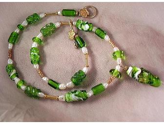 Vermeil findings and freshwater pearls give this 20 inch necklace a regal bearing. Handcrafted glass beads are green with aventurine and rolled white for added texture on this attractive necklace . The essence of Deb Rich's artistic expression is revealed in each lampwork bead that she creates in her studio. Deb's beads exhibit her desire to create and inspire change through community outreach. These jewelry pieces are offered exclusively through cMarket to support the fundraising efforts of non-profit organizations. Lampwork glass reflects both the heartfelt passion and interpretative expression of Deb Rich. Her artistic resume includes fantasy sculptures, creatively fashioned from found-objects and recycled materials. Deb's Glass Designs are truly hypnotic, one-of-a-kind pieces that cannot be replicated or manufactured by a machine. Deb only sells jewelry pieces that capture the grace and flow of glass artistry. All jewelry is made with sterling silver or copper findings, Czech or Swarovski Crystals, and various complementary beads, making Deb's Glass Designs positively the best choice.