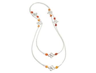Wear it long or as a double strand. This 44-inch necklace incorporates hammered handmade sterling silver daisy motifs with carnelian accents. Designed by a former WSP mom whose fabulous jewelry is much in demand.