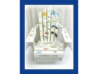 This chair is covered with backyard friends who find "alternative" homes to take up residence. From earwigs living in a tin can to butterflies fluttering above the flowers, this chair has all of your critter homes and gardens. See if you can spot them!