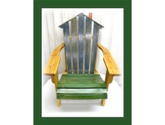 The 'Home' theme is carried through in this chair with a house designed by the artists. The blue of the chair represents the house with the green bottom of the chair representing the yard around the house.