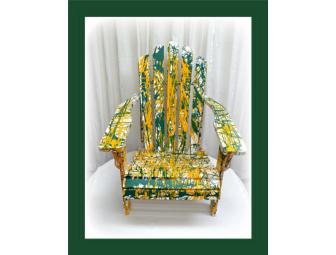 This Jackson Pollock themed chair is splattered with green and gold paint over a background of white.