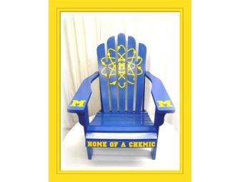 Decorated with the Midland High chemic on the back and "Home of a Chemic" on the seat, this chair exemplifies chemic pride! Painted with the background color of blue and the decals in gold.
