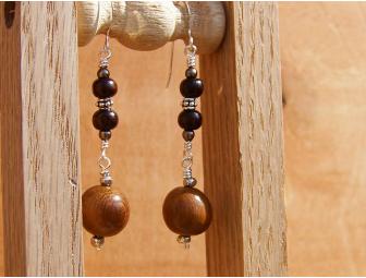 Note: These photographs are of an identical pair of earrings. The earrings in this auction are the same design and are alike in every way except that the large wooden rounds are slightly darker (similar to the color shown in the small wooden rounds in these pictures).