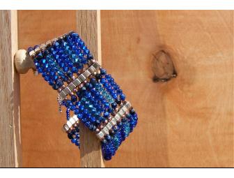 Shades of blue and silver glass handwoven into a bold 1-1/4" wide cuff bracelet. Closes with sterling silver toggle clasp.