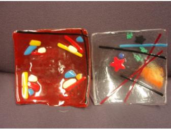 Two multi-colored square candy dishes made by FSS Upper School students.