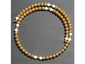 Glass bronze pearls with shell beads and gold filigree beads are strung on gold plated memory wire. No clasp, no string, just wrap it and go!