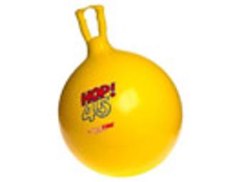 As seen in the West Side Preschool gym! This Hop Ball is the very best quality in hopping balls! Made in Italy from super strong yet soft latex-free vinyl for long lasting use and durability, this ball is a great exercise product for indoors and smooth, safe outdoor surfaces. Promotes children's body coordination, balance and lymph circulation while providing a fun workout. Special patented handgrip safety handle. Maximum sustainable weight of 300 pounds. For ages 3 years and older.