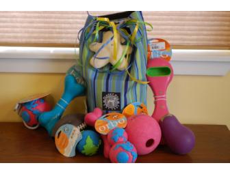 This is a feed bag filled with the super durable Planet Dog toys. Planet Dog gives a percentage of their profits to the Planet Dog Foundation, whose mission is to promote and celebrate programs in which dogs serve and support their best friends. The foundation's goal is to support organizations that enable dogs to give back to people in need.