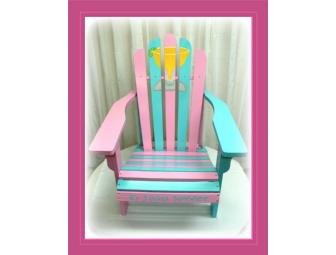 Painted in summer colors of teal and pink, this chair will inspire those to sit back and relax! A margarita is painted on the chair back and “It’s 5 O’clock Somewhere” on the seat of the chair.