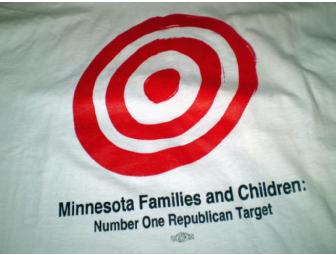 This vintage t-shirt is printed on front (Minnesota Familes and Children: Number One Republican Target) and back (Proud to be a Republican Target - WELLSTONE FOR SENATE!). Size XL and made in the USA.