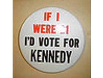 The 2 buttons in this set including "If I were 21 I'd vote for JFK" and a photograph with red and white border.