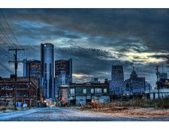 The natural ebb and flow, the decay, death and growth of business, the squalor of poverty, drugs, and violence -- men and women continue to struggle to create anew and give birth to hope. This is a composition of a decaying city in dark clouds against the backdrop of "man's" planned renaissance, the Detroit Renaissance Building. The essence of Detroit, a beautiful raw contradiction, is captured in this photo.