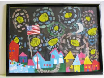 "Starry Night Over North" was made by the students in the North First Grade Class. It is a framed cut-out North skyline with a Van Gogh-styled painted starry night overhead.