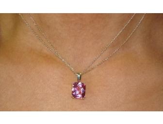 Pink lab-created saphire in an 18K gold trimmed Sterling setting is hung on a fine, double chain.