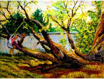 "The Swinging Tree" was painted by Sandra while she was teaching painting at an orphanage in Khon Kaen, Thailand. Most of the children had never painted before or had any art classes before in their lives. They loved the classes. Early one morning the children woke to find Sandra painting this picture of an old tree on the grounds of the orphange.