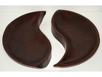 Two wooden serving bowls, hand-carved in Thailand, into a perfect yin yang shape. The perfect size to serve any appetizer or to simply display in your home. Bowls are 14" in length.