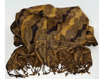 Long, luxurious, and elegant, woven in Thailand. Gold and black cashmere shawl, 28" wide x 80" long.