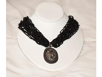 This necklace, hand-crafted in Thailand, is 23" long, with multiple strands of beads and a silver and stone pendant.
