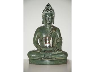 Seated and serene, this Buddha holds a votive candle on a tray. The tray could also be filled with birdseed: the polyresin Buddha is weatherproof and can ornament your home or garden. It's 15" high, 9" wide, and 7" deep.