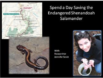 Join amphibian researcher Jennifer Sevin, Managing Director of Capacity Building and Academic Programs at the Smithsonian Conservation Biolgoy Institute, as she studies the endangered Shenandoah salamander in Shenandoah National Park. Up to four people will be able to spend half a day with Jennifer and learn about her research, see these amazing creatures and learn about the global amphibian crisis. The Shenandoah salamander is found only on three mountaintops in Shenandoah National Park.