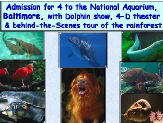 The National Aquarium in Baltimore features hundreds of exhibits with more than 16,500 animals and now includes a new 4-D theater that combines the high-definition drama of a 3-D film with special sensory effects, like mist and wind. Tour includes admission for up to 4 people to the Aquarium and entry to the famous 4-D theater, dolphin show, as well as a behind-the-scenes tour of the Aquarium's renowned rainforest and free-ranging golden lion tamarin exhibits with Curator Ken Howell.