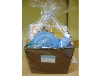 Basket includes workbooks, pencils, bags, yo-yo, water bottle, markers, frisbee
