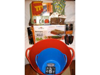 10.5 gallon Red TubTrug & 3.5 gallon Blue TubTrug, Fiskars set of gardening tools (pruning shears, trowel, cultivator, transplanter), 5 packages Heirloom seeds (red tomato, yellow tomato, bean, cucumber, radish), His & Hers gardening gloves, Fiskars kneeling cushion, Burpee Ultimate Seed Starting Tray with 72 Burpee Super Growing Cubes, and "Newspaper, Pennies, Cardboard, and Eggs - For Growing a Better Garden" by Roger Yepsen.