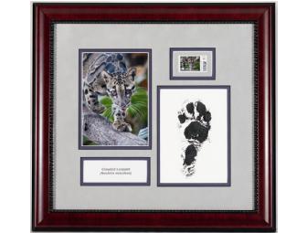 A Clouded Leopard postage stamp, a photo, and a paw print make a handsome collage, framed (18” wide x 17” tall) and ready to hang.
