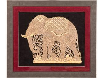 Hammer-carved painted leather is an ancient southern Thai artistic tradition, exemplified in this striking silhouette of an elephant. Framed, 30” wide x 26” tall.