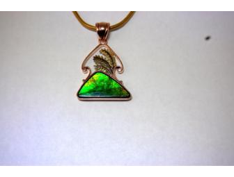 14k rose and yellow gold pendant set with a Canadian Ammolite at the bottom.