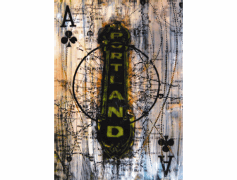Please note that the description above was submitted by the artist. Also note that the image depicted with the listing is the image used in the Portland Project Deck ... which may be slightly different from the original artwork you are bidding on. The original artwork also may have had additional aspects or features digitally added to prepare it for inclusion in the deck. In some listings (but not all) we have mentioned differences between the card image and the original artwork, but in all cases you take final responsibility to be comfortable with the piece of art you are bidding on. If you have any questions about the difference between the image and the original piece, we encourage you to see the actual piece of art in person before you bid (they are all even more incredible live). In all cases the artwork is ready to hang but the pieces vary in terms of framing, attached hardware, etc. To find out where you can view the actual artwork, visit www.facebook.com/artinhandpdx or view the home page of the auction where we have all the showings listed. If you are the winning bidder we will expect you to make arrangements to have your art picked up either between 9-10pm at the closing reception Saturday evening May 22 or over the following couple of days at Splendorporium (3421 SE 21st Ave) between 11am and 5pm. If you prefer the artwork to be shipped, expect to pay actual packing and shipping costs (which will vary for each item depending the size, framing, etc.) plus a $25 handling fee. Note that this could get expensive, so we encourage you to make arrangements to have it picked up locally. Note that we will not pre-calculate packing and shipping. Although the auction requires you to register a credit card to bid, we will NOT automatically bill your card if you are a winning bidder, as we would prefer to collect your payment by check or cash when you pick up your artwork. You will receive notice from us if you are the winning bidder with your options.