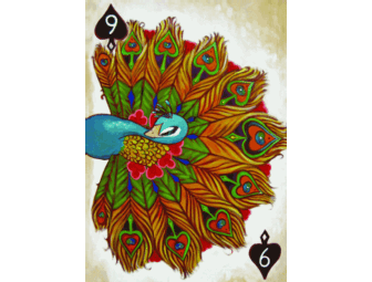 The colorful, graphic quality that has also characterized my recent work lent itself well to this project, and the playful, cartoonish quality that has made appearances in my art since childhood seemed to speak well to the nature of the game. Maybe the peacock knows something about the other players' hands that you don't...?