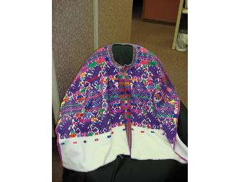 This beautiful collectible blouse is part of the traditional garb of San Pedro & San Juan Sacatepequez, Guatemala. It is hand-woven and embroidered in bright wools. The large zig-zag on the front represents the rugged wooded hills around these villages.