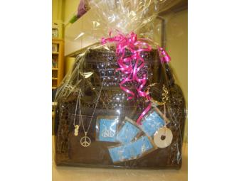 1 large brown overnight carry bag with brown travel pillow & 1 matching cosmetic case that contains 5 pairs of sterling silver earrings( 1 peace/1 butterfly/1 oval/1swirl/1 star pattern set of earrings) also contains 3 necklaces(1 peace/1 slipper pendant and 1 large shell pattern circle necklace on suede cord. It also contains 1 watch braclet that is an animal print.