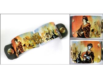 Japanese Graffiti Cuff: Fits up to size 7 1/2" circumference wrist. Lined with blue leather and the image is sealed with a gloss finish.