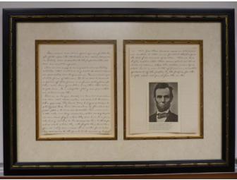Beautifully framed copies of American history. First is a photo copy of the Gettysburg Address in Abraham Lincoln's own handwritting. The second is copy of the letter that George Washington sent accepting the invitation to become the first President. These were copied by RR Donnelly. A booklet is included explaining the process and authenticating the copies.