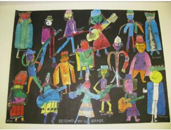 This collage was inspired by the paintings of Miriam Shapiro. The Second Graders made figure drawings of each other dressed in crazy clothes. The collage is framed.