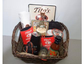 An overflowing basket of Tito's Handmade Vodka goodies including: