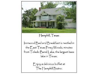 This package includes a memorable stay at the Ironwood Bed and Breakfast which is nestled in the East Texas Piney Woods, and dinner for two at Hemphill Bistro.
