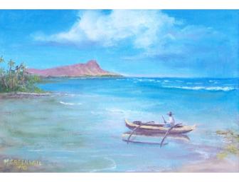 This painting measures 9 3/4 X 12 inches and is enclosed in a koa and gilded frame.
