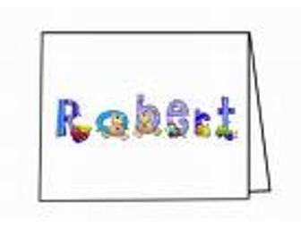50 personalized children's note cards and corresponding colored envelopes with choice of motif and typestyle.