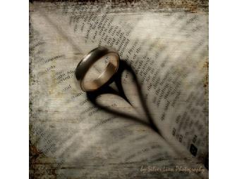 The picture depicts a wedding ring casting a shadow on opened pages of the Bible. The shadow creates a heart shape.