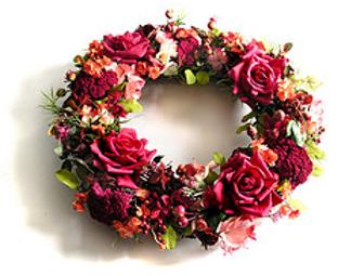 This beautiful red hued silk flowered wreath will brighten any room or doorway.