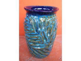 This beautiful handcarved and wheel thrown vase radiates in luminous shades of cobalt and turquoise blue. High fire cone 6 oxidation stoneware. 8" tall and 4 " wide. It's just waiting for a bouquet of fresh flowers to compliment it's beauty!