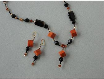 This exquisite necklace and earrings set features coral, vintage 1950’s glass, Italian “Murano” glass and carnelian stones with a secure barrel clasp on the necklace and dangle hooks on the earrings. The design is one of classic elegance, inspired by the rich packaging design and ‘east/west’ fragrance of the famous perfume. Necklace length: 19”