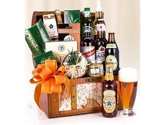 A handsome travel trunk holds Red Stripe from Jamaica, St. Guinness Stout from Ireland, Newcastle Brown Ale from England, Molson Lager from Canada, Corona from Mexico, and Heineken from the Netherlands. The beers taste delicious when combined with Seasoned Almonds, WVM Sweet & Hot Stone Ground Mustard, Rosemary & Roasted Garlic Crackers, Saraivanov Smoked Salmon, Wasabi Peas, Salted Pretzels, and California Pistachios. Measures 14" x 11" x 12".