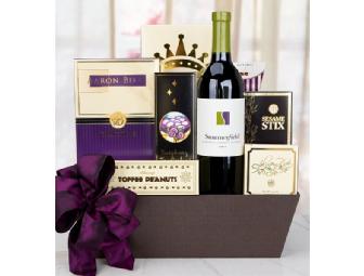 A bottle of Summerfield California Cabernet Sauvignon and a host of snacks will be delivered in a handsome magazine tray. We include time-tested favorites such as Seasoned Almonds and Sesame Stix to ensure that the recipient will be satisfied, even if you are not sure of their exact tastes.